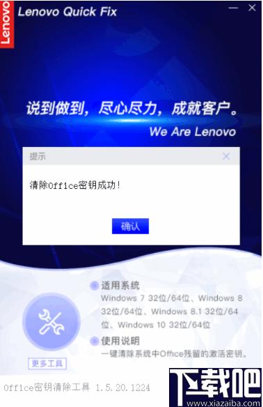 5、清除完成后弹出提示窗口“清除office密钥成功”,点击确认关闭窗口。